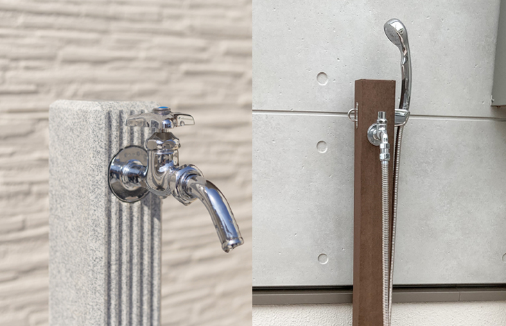 立水栓はデザインが様々で、円柱やペットの足を洗いやすいシャワーヘッド付きのものもあります。