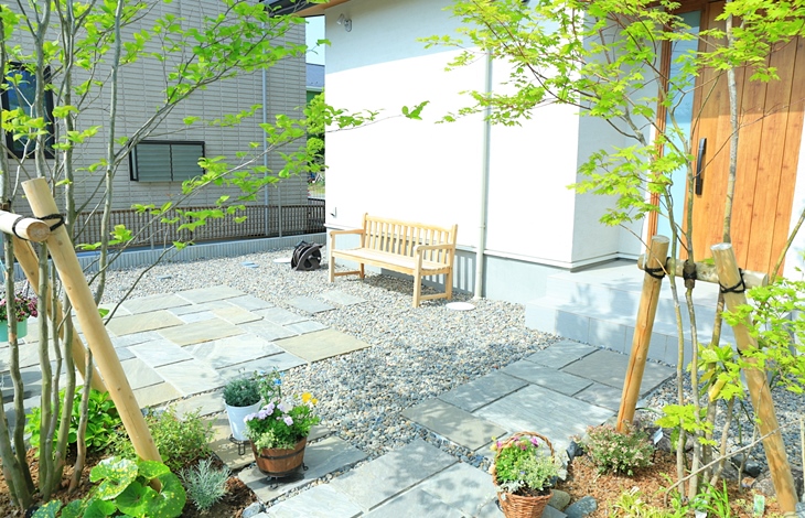 例えば、石と木、あるいは石と植栽など、異素材の組み合わせによって奥行きや表情を出すことができます。