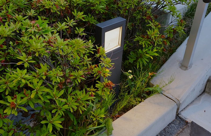 また、アプローチの足元を優しく照らすフットライトは、歩行の安全性を確保しながら、足元に陰影を作り出し、奥行きを表現します。
