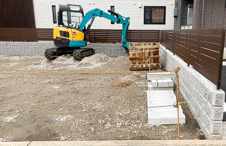 駐車場を土間コンクリートで整備する工事はまず、今ある土を掘り起こし、路盤材を敷いてしっかりと固める(転圧)といった下準備が必要です。