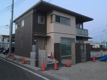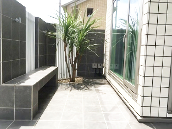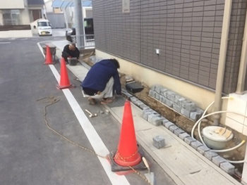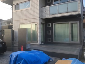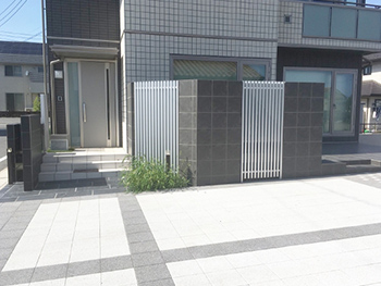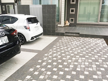 | 施工内容 | 駐車スペースのインターロッキング工事 ・門柱・花壇 ・目隠しタイルデッキ ・植栽 ・雑草対策敷砂利 |