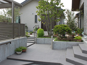 玄関からガレージまでの道にはタイルを敷き、洗練された雰囲気を創り出しています。