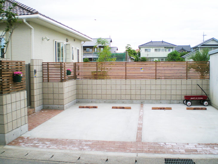 門は木を使って温かいイメージになるよう、ご提案をしました。 駐車場は2台分、コンクリートやブロックを組み合わせ、全体的な雰囲気を壊さないようにしました。 また、こだわりのデザインに関しては、何度も打ち合わせをして納得していただけるものにしました。 |