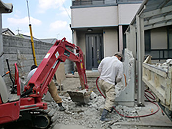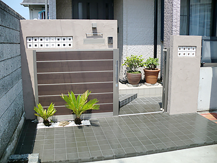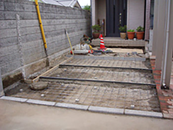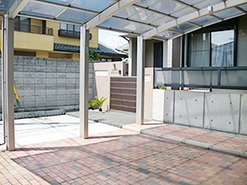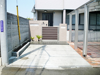 | お客様のご要望 | 玄関からカーポートまでが塀で区切られており、一度外まで出ないと車に辿りつけないのが不便でした。 また、玄関までのアプローチに傾斜がなく、水たまりができてしまうので解消してほしい、とのご要望でした。 |