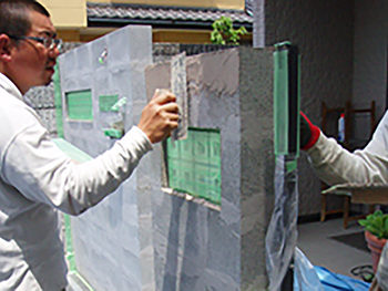 新しい門扉はブロックの間にガラスや照明を入れながら組み上げていきます。