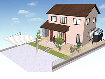 | ご提案内容 | 駐車場には車2台分を収容できるカーポートを設置し、お部屋の中が丸見えになってしまうテラスのまわりには、新しくフェンスを設置することをご提案しました。 |