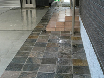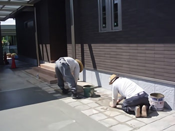 門から玄関までのアプローチには、職人が丁寧にタイルを敷き詰めていきます。