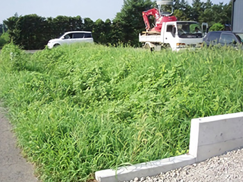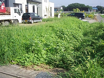 駐車場付近に用水路が通っていることもあり、雑草が生い茂っていました。 フェンスが隠れてしまいほとんど機能していない状態だったので、防犯面に加えて安全面も考慮し、背の高いフェンスの設置をご提案させていただきました。 |